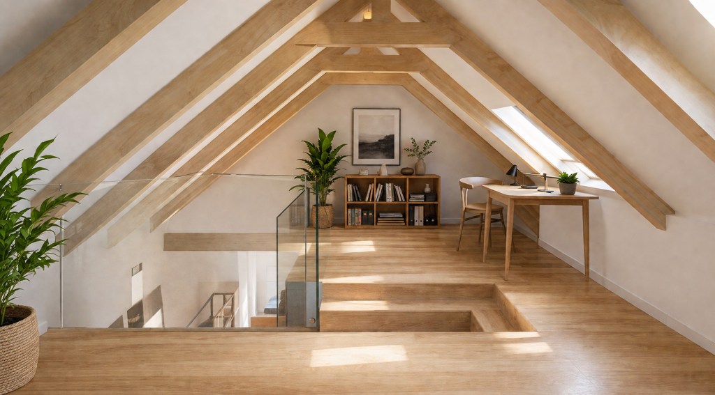 - Aménagement du comble au R+2 : création d’une chambre, d’une salle de bain et d’une mezzanine au R+2