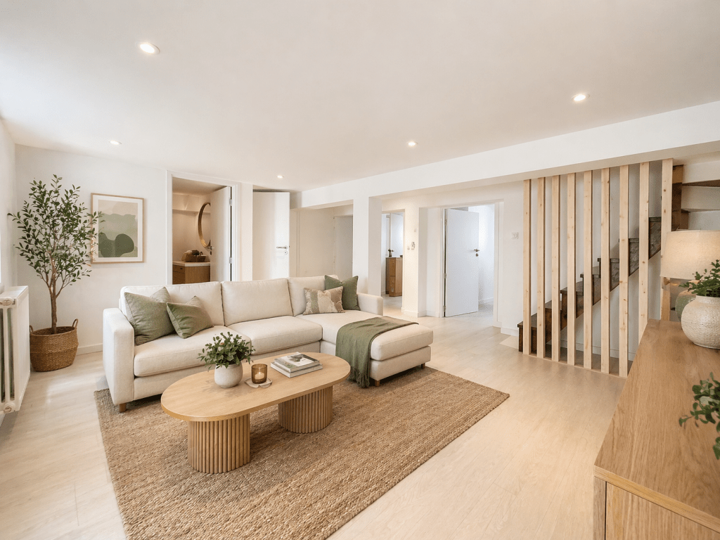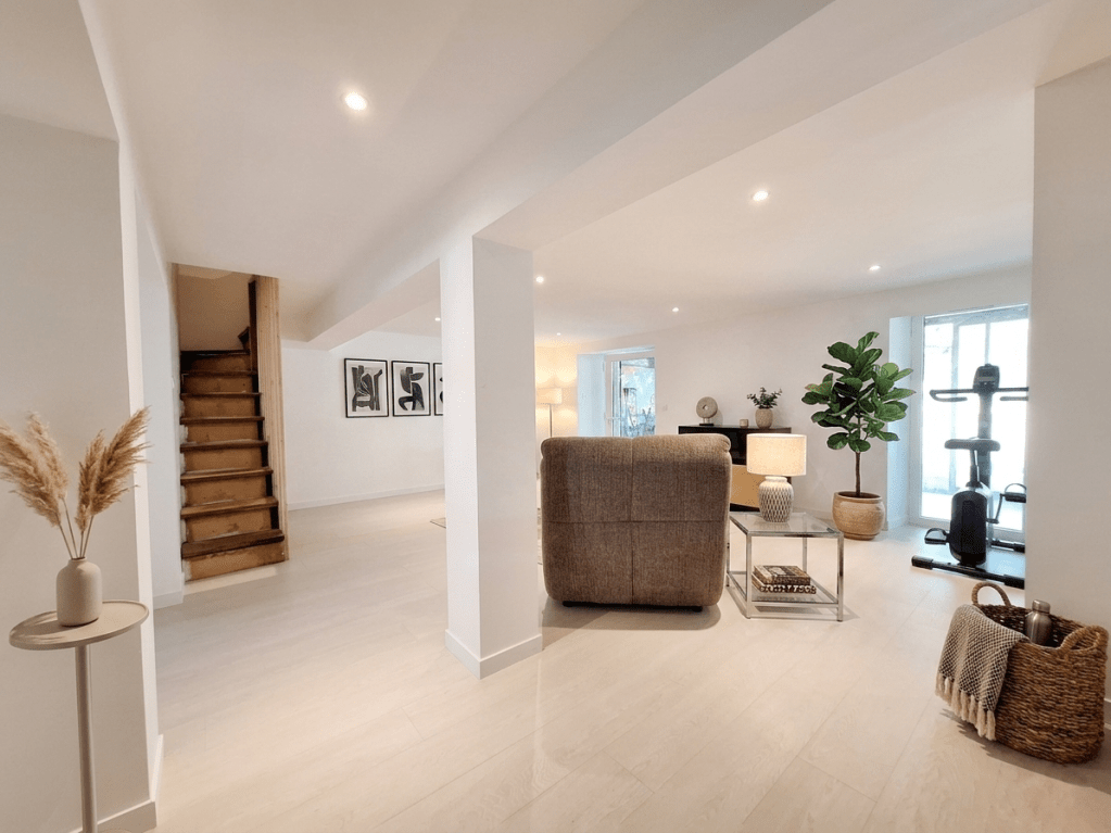 - Aménagement du rez de chaussée (cave) en un appartement avec cuisine, salle d’eau, wc, chambre, pièce de vie